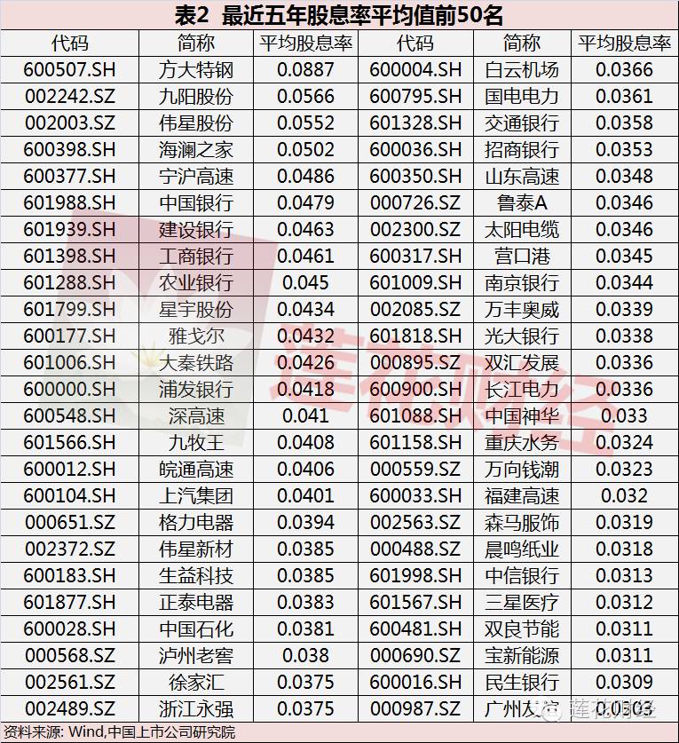 2011年至2015年,年度股息率平均值在2%以上的上市公司共118家——这些公司股息率都高于当下1年期银行定期存款利息的1.5%,甚至有些超过银行理财产品——应该是当下社会上追求低风险和相对高收益资金的投资选择标的。见表2。