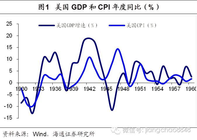 美国30-40年代低利率的起因是经济危机。1929-1933年大萧条期间美国出现严重的经济衰退和通货紧缩,30-33年间真实GDP下降27%,物价萎缩24%。为应对经济危机,美国货币当局采用了扩张性的货币政策,大幅降低联储对银行的贴现利率,从6%左右的最高点一路降至36年的1%。罗斯福新政取得了良好效果,到1936年,GDP大幅回升至12.5%,物价则保持在1.5%的温和通胀水平。