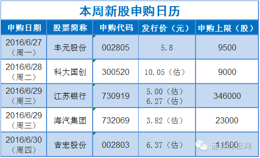 山东丰元化学股份有限公司人民币普通股股票将于6月27日(周一)在深交所中小板发行。股票简称“丰元股份”,申购代码“002805”,发行价5.8元/股,市盈率22.97倍,行业市盈率43.93倍,申购上限9500股,顶格申购需深市市值9.5万元,中签缴款日为6月29日(周三)。