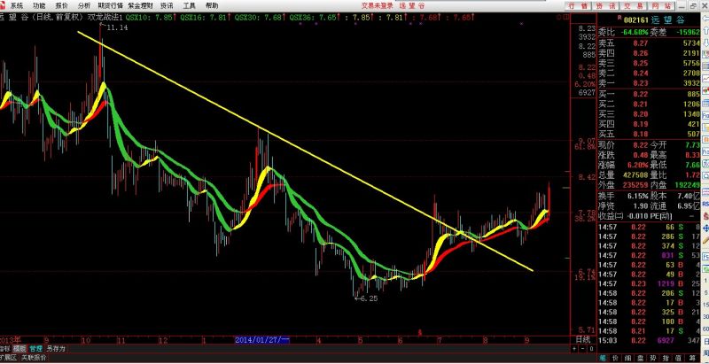 从日K线的趋势来看,前面几个高点的连线压制趋势线已经被有效突破。双龙战法中的长短趋势组(笔者称之为黄龙与红龙)与趋势线连线 构成了一个反弓形态。反弓形态是一个反攻信号。表明空方打压完多方的一次反攻后,已经无力再次打击多头的反攻,后市以多方主导。倘若期间再出一点有关物联网的什么利好,股价的上升空间将更好。