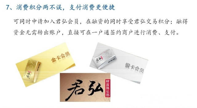 6、消费积分两不误,支付消费更便捷:可同时申请加入君弘会员,在融资的同时享受君弘交易积分;融得资金无需转出账户,直接可在一户通签约商户进行消费、支付。