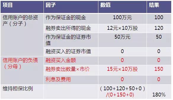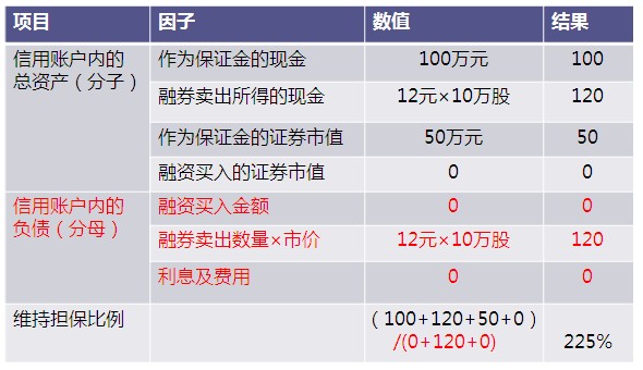 举例:某客户信用账户中有作为保证金的现金100万元和证券A市值50万元(折算后),客户以12元/股的价格融券卖出10万股证券B。其间产生的利息及费用忽略不计。