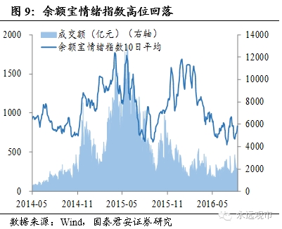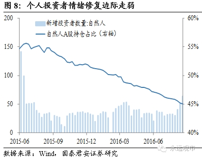 上周新增自然人投资者数量虽有上升,场内自然人持仓比例下滑动力未减,个人投资者情绪边际趋向谨慎。新增自然人投资者数量上升24.9%至63万人,处于今年以来的最高水平,但自然人持仓比例继续下滑0.19个百分点至45.04%。余额宝情绪指数本周上升至近一月新高1056.94后大幅回落至823.5点,相较前期周五持平,个人投资者情绪边际趋紧。