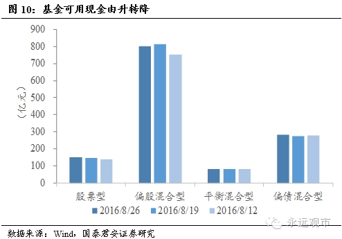 基金可用现金回落,整体仓位下降,偏股型基金仓位趋稳。数据显示股票型基金可用现金较前期仅小幅上升1.41%,而偏股混合型则由升转降1.37%,所有类型基金可用现金总和下降0.18%,逆转了近一个月的升势。基金仓位在上周持续下降,但出现略微分化,其中混合型基金仓位持续下降至52.66%,但普通股票型、偏股混合型略有下降但与上周基本持平至85.36%、77.53%,随有趋稳迹象,但将只是短暂停留,下降趋势未改。