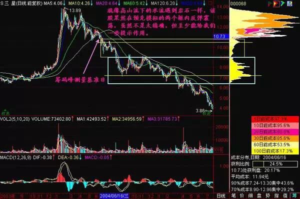 股价一般会在下筹码峰处构筑【下跌中继】,如果没有下筹码峰的股票呢?那就到出现三金叉时构筑一个【下跌中继】,但只要下跌时间不长,离开前头部不远的地方,无论什么样的三金叉,都不是底部,而只是【下跌中继】。要长期下跌,跌无可跌,头上的筹码峰已经全部割肉到下面了,股价底部抬高了,那时才可能构筑底部。