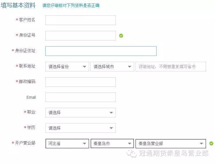 4、填写基本资料:系统支持读取身份证信息,但会有个别错误需要改正,开户营业部选择:河北省 秦皇岛市 秦皇岛营业部