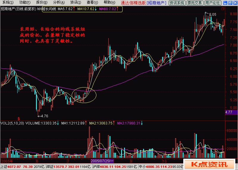 2:季价托(由20日、40日、60日均价线组成),该组合的稳定度较好,对中长期底部的提示作用较好,但对阶段性短期底部的提示作用稍显迟钝;见(图3)