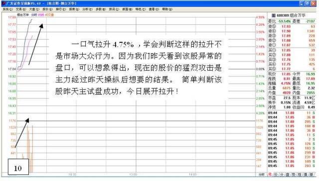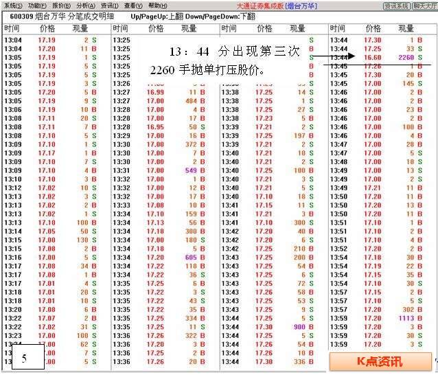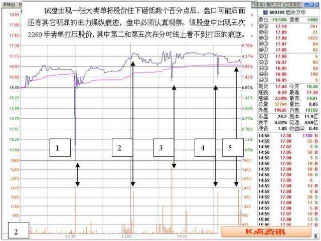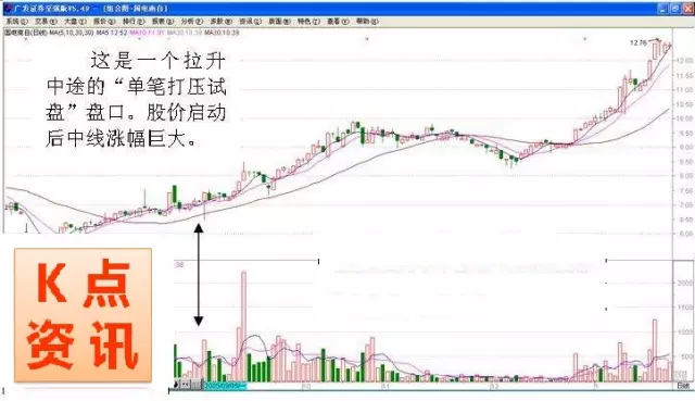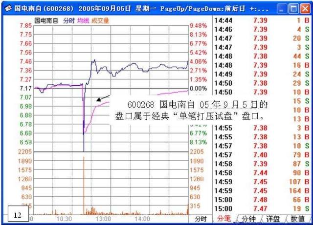 单笔打压试盘盘口是指盘中交易时在没有明显的预兆下出现一张大卖单将股价往下砸低数个百分点的主力操纵行为。单笔打压试盘出现在一般个股盘口大卖单成交后股基本在一分钟或者几笔交易中恢复原来的交易状况。【部分个股分时图中可以看到分时线的打压痕迹,不部分看不到。】小部分个股出现单笔打压试盘后分时图中分时线呈 V 字形拉起。主力用一张大卖单将股价往下砸低数个百分点的,操纵行为目的只要是了解目标个股看不见的买盘的承接力如何!