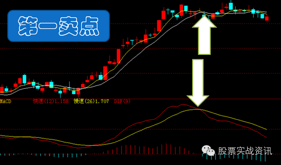 股价在经过大幅拉升后出现横盘,形成的一个相对高点,投资者尤其是资金量较大的投资者,必须在第一卖点出货或减仓。此时判断第一卖点成立的技巧是“股价横盘且MACD死叉”,死叉之日便是第一卖点形成之时。