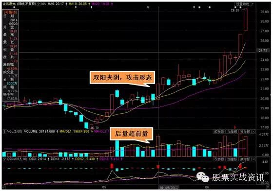 2. 双阳夹阴的三根K线都站在短期均线(5、10、20日均线)之上,则爆发力更强。如果仅仅第二根阳线站在均线之上,上涨力度不是很强,如两根阳线都站在均线之上,且均线又刚刚呈多头排列,后市空间不可小视。