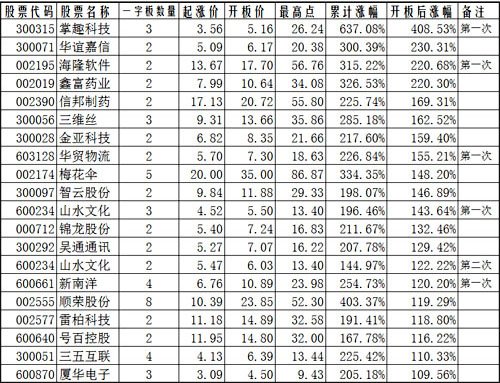 涨幅最大的掌趣科技,从去年2月出现第一次连板算起,开板后涨幅仍高达408%。