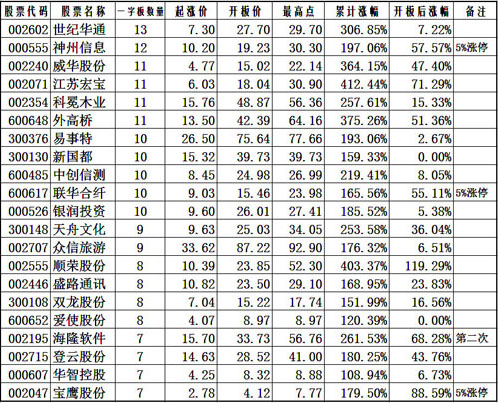其中,连板数量达到或超过10个的,有世纪华通、外高桥等11只;连板7个或以上的,共有21只(见表1)。