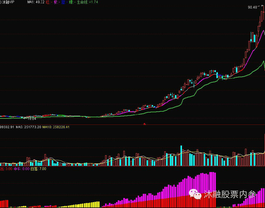 最近有很多涨了十倍的大牛股,回头去看看走势图,可以发现成交量放得最大的往往是在行情中段(如图一沐融指标所示), 估计那时是第一批庄家兑现离场, 而意见分歧的新主力重新接盘所致。再到后期,即便拉升,成交量也不大了。 毕竟10块的股票成交一亿股,和100 块的股票也成交一亿股,消耗的资源是不同的。 涨升的后阶段,持有人分歧不大而且筹码集中,往往越涨越缩量。 所以教科书上说“价量齐升”的现象,在多数大牛股那里得不到很标准的体现。