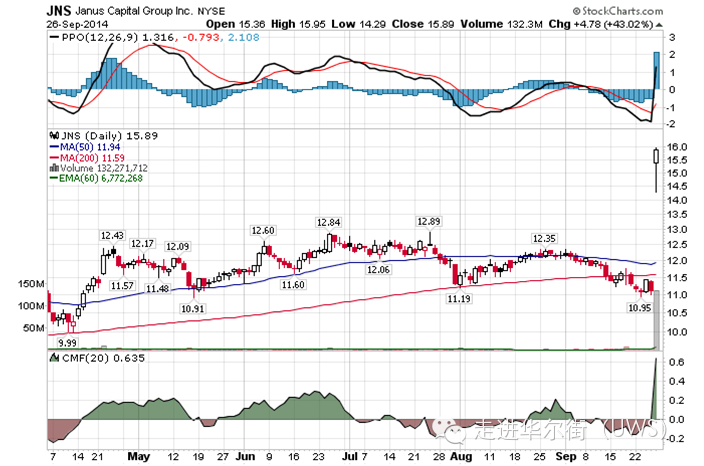 最劲爆的反应来自于Janus 基金管理公司的股价,居然暴涨43%,创公司历史上最高单日涨幅,市值也一天里增加了6亿美元!