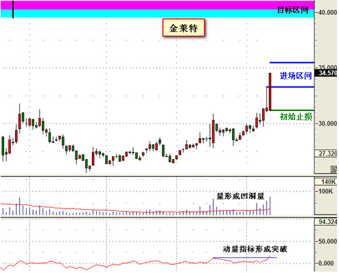 金莱特技术上,股价涨停突破34整数关口,成交量呈凹洞结构,均价系统开始多头发散,MACD零轴上方金叉,ROC指标形成突破,表明股价进入阶段主升浪过程。