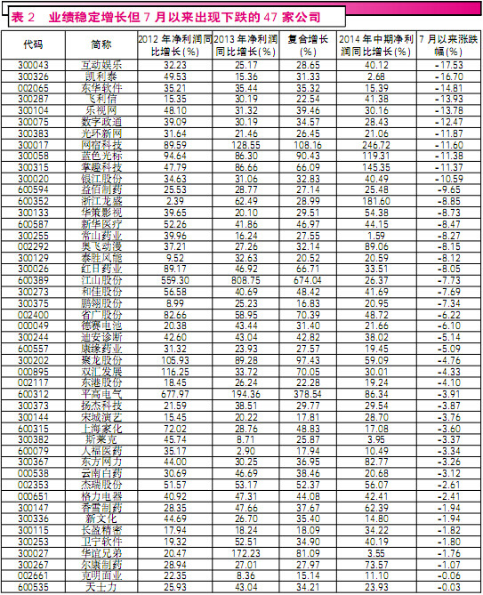 此外,统计数据显示,2011年~2013年,在历年净利润持续盈利的前提下,两市共有458家A股公司净利润始终呈增长趋势,复合增长率保持在15%以上,且今年上半年业绩依然同比增长。俗话说,业绩是股价的基石,观察此类基本面持续增长的公司,其中265家公司自7月以来同期走势强于大盘,占比57.86%,但仍有不少绩优公司股价走势较弱,甚至有47家公司股价呈下跌趋势。如互动娱乐,2011年~2013年净利润分别为8111.77万元、10726万元、13425.6万元,期间复合增长28.65%,今年中期公司7238.13万元的净利润相比2013年中期再度增长了40.12%,但就在市场股指重心不断上移的同时,7月以来其股价却下跌17.53%,类似个股还有凯利泰、东华软件、益佰制药等。而理论上讲,此类业绩增长稳定、但近期下跌严重的公司,显然已具备了理论上的投资价值(见表2)