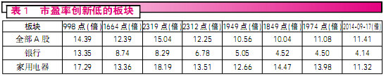 统计显示,目前以9月17日的收盘价和今年中期的净利润为基准,全部A股的动态市盈率为11.41倍,尽管A股已重新站上2300点,但和之前几次历史底部的估值水平比较,A股整体市盈率却仍徘徊于底部区域。当然,目前A股整体被低估的状态,银行股起到了决定性的作用,历史数据显示,近年来A股市场最被关注的两次历史大底,2005年的998点和2008年的1664点时,银行股的市盈率分别为13.35倍和8.74倍,而目前银行股的市盈率仅为4.14倍,银行股的高权重摊低了全部A的整体估值水平。