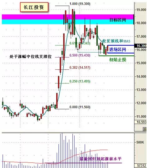 长江投资该股自19.3见顶以来,量价同步下降,目前量能水平到达了8月8日起涨以前的量能水平,从量能角度具备企稳反弹可能。K线上,9月17日跌破15.82颈线后,近5个交易日有4个交易日收于该颈线之上,并且面临上波涨幅中位线及8月14日上涨中继的支撑。9月24日收出日出线,收复5日均线,5日均线开始上扬。技术上具备止跌反弹的机会。以本波低点16作为止损,具备小亏大赚的交易原则。