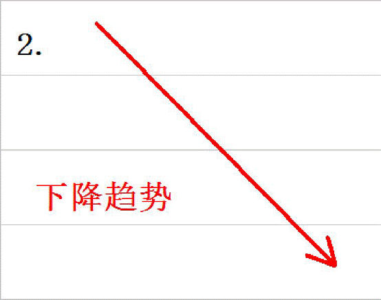 2. 下降趋势,用红色走势线表示,对应原文的红墨水。下降趋势中的最低和最高关键点,用黑色下划线标注。