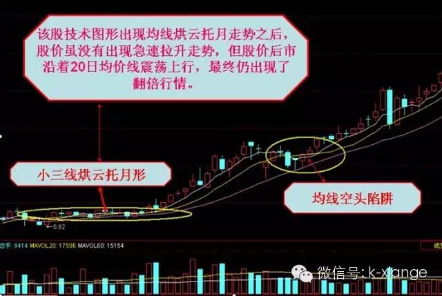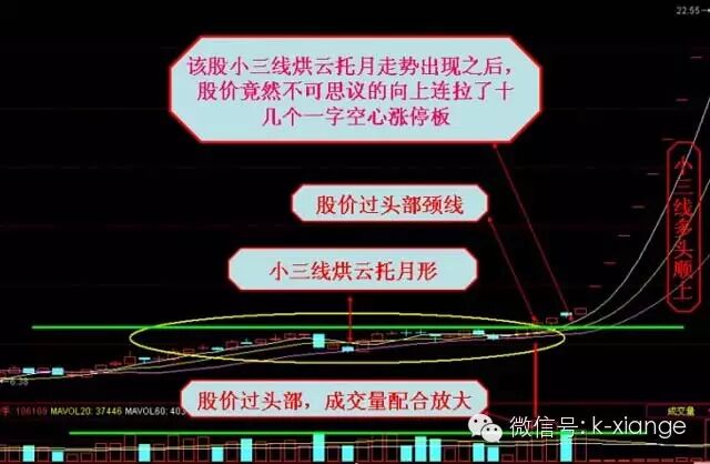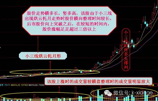 3、股价走势横多长,竖多高,由于该股小三线形成烘云托月形走势时,股价整理时间较长,后市股价向上突破之后,短时间内股价涨幅超过三倍以上。