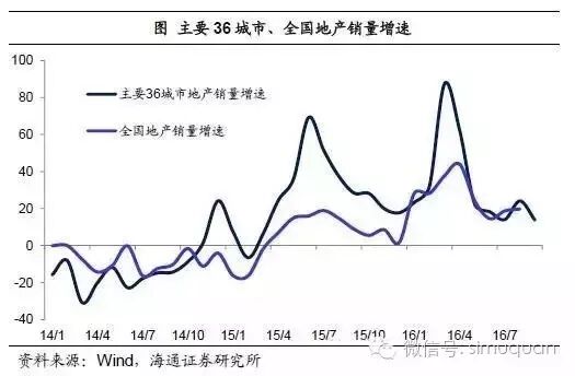 地产销售或接近顶部。再来看中国,16年的经济增速保持平稳,其中火爆的房地产是重要贡献,前8个月地产销售面积同比增长近30%,也带动地产投资增速由负转正。但在我们看来,今年的地产销售或已接近历史的顶部,未来面临极大的下行风险。