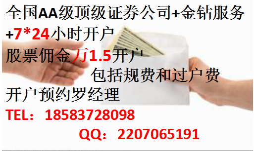 ★【优惠】开户佣金「万分之2.5」,量大低至「.5」含规费+过户费(帮您节约成本) ★【专业】资讯推送+理财推荐+顾问1对1服务(同样是开户,有服务更佳) ★【便捷】开户仅需5-10分钟,全国上百家营业部连锁服务! (证监会推荐‘网上开户’已4年,安全、省时、省力) ★【实力】专业的投顾为你指点迷津,为你的资金保驾护航 ★【全国股票开户服务咨询热线】TEL:18583728098 QQ:2207065191 |