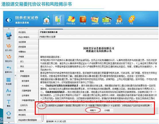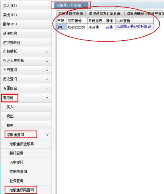 点击上方“证券”--左侧菜单“港股通”--“港股通查询”--“港股通权限查询”--点击“开通”