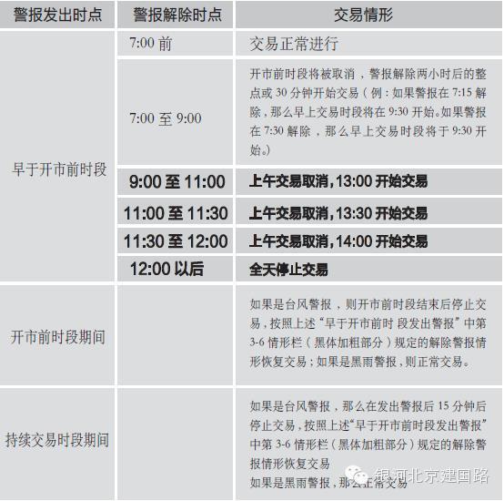 由于地处台风和黑色暴雨的多发地,香港市场在处理台风和黑色暴雨对交易的影响上形成一套既定的成熟做法,即按照八号及以上台风和黑色暴雨警告(以下统称警报)发出时间为开市前时段之前、开市前时段期间以及持续交易时段期间等三个不同时段有不同的应对措施。具体安排如下: