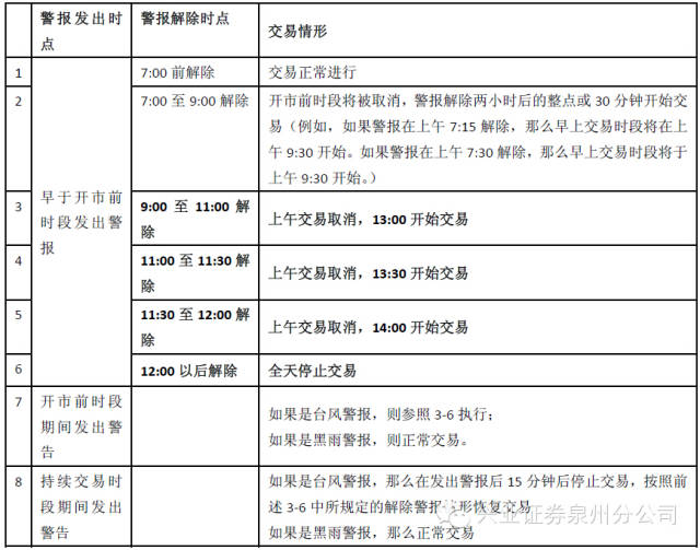 由于八号及以上台风和黑雨警告(以下统称警报)等恶劣天气情况下的,交易安排如下: