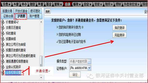 第二步:登录交易软件—沪港通菜单—业务权限设置,依次进行“知识测评—风险测评—电子签名约定书”三个步骤。