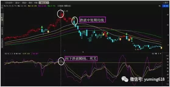 3、股价前期出现很大涨幅,随后下调,J线和K线在高位(80附近)几乎同时向下突破D线形成死叉,股价也同时跌破中短期均线,说明股价将转为弱势,后期将出现下跌行情,80附近的高位死叉,投资者应及时离场。