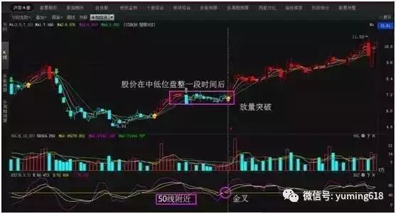 1、当股价在低位徘徊很长一段时间后,kdj曲线也徘徊在中位(50附近),kdj中的j线与k线同时向上突破d线,形成金叉,此时成交量也在放大,说明短期股价将上涨,投资者可大胆买进个股。