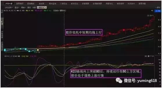 2、当KDJ曲线向上突破80以后,并股价在上方运行,此时买入信号发出,后期股价将出现上涨行情,投资者可大胆买进,若是股价同时依托中短期均线上行,说明后期股价上涨概率越大。