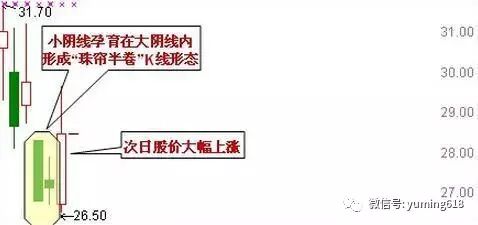 下一个台阶,显示短期内抛盘出尽。此K线形态看出来就像卷帘一般,已经可以隐约感知春天的信息,正所谓“闹花深处层楼,画帘半卷东风软”,故称“珠帘半