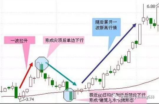 猪笼入水是指个股经过低位收集后开始的猛烈拉升,在高位形成尖顶后,单边下行不做头部的确认动作,在接近60日或150日均线时,以一根中阴线向下突破,走势吓人,但5曰乖离率出现明显背离,这是缩量洗盘结束的最佳买点。随之而来的将是一波向上攻击前期高点的行情。