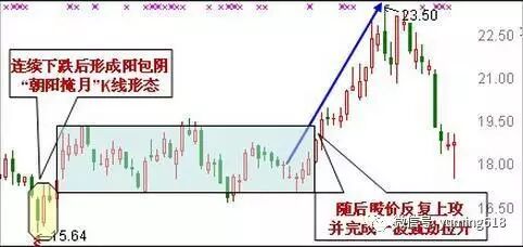 近当日最高价收盘,将前一日的阴线完全包住。此K线形态的前一根阴线犹如下弦月还挂在空中,后一条大阳线却已如朝阳从东方升起,将残月光辉掩盖,故称“朝