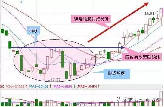 交量经常较少,而上破颈线之时成交量必须迅速放大;2、突破之后常常有回抽,在颈线附近自然止跌回升,从而确认往上突破有效;3、第一个低点与第二个低点