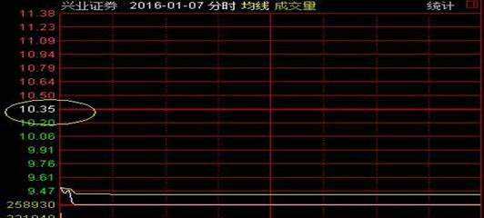 在交易行情中,查询除权除息日1月7日当天的前收盘价即为10.35(前收盘价由原来的11变为除权价10.35),除权当日(2016年1月7日)分时走势图如下:(黄色的圈即为除权价)