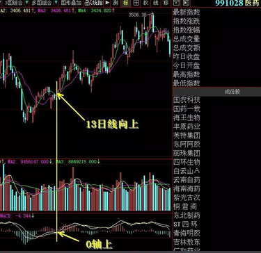 一、主升点发生时,MACD黄白线位于零轴上方。股价在13日线上,此种情况占了主升浪的85%的发生情况。