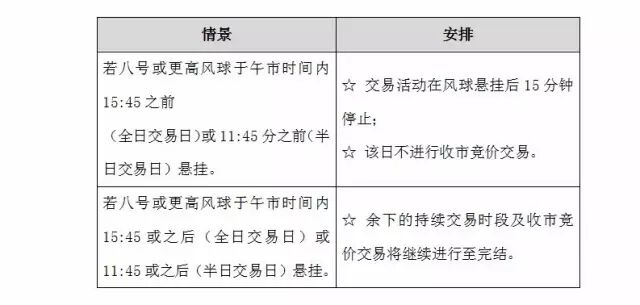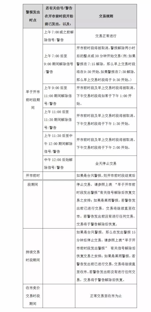 由于地处台风和暴雨的多发地,香港市场在处理恶劣天气对交易的影响上形成一套既定的做法,即按照八号及以上台风和黑色暴雨警告(以下统称“警报”),发出时间为开市前时段之前、开市前时段期间、持续交易时段期间以及收市竞价交易时段期间等四个不同时段,分别作不同的应对措施。具体安排如下: