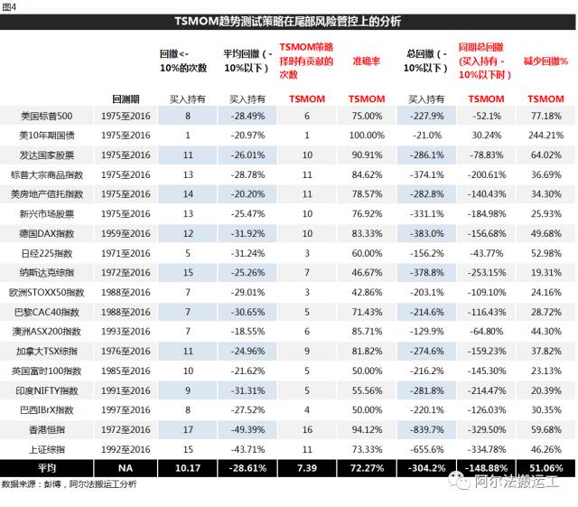 以美国标普500为例,从1975年-2016年,总共发生回撤低于-10%也就是跌幅大于10%的次数是8次,平均每次跌幅达到28.49%之多,TSMOM趋势择时有贡献的次数是6次。也就是说在这8次跌幅大于10%的回撤中,TSMOM择时能有效减少其中6次的跌幅,准确率达到75%。