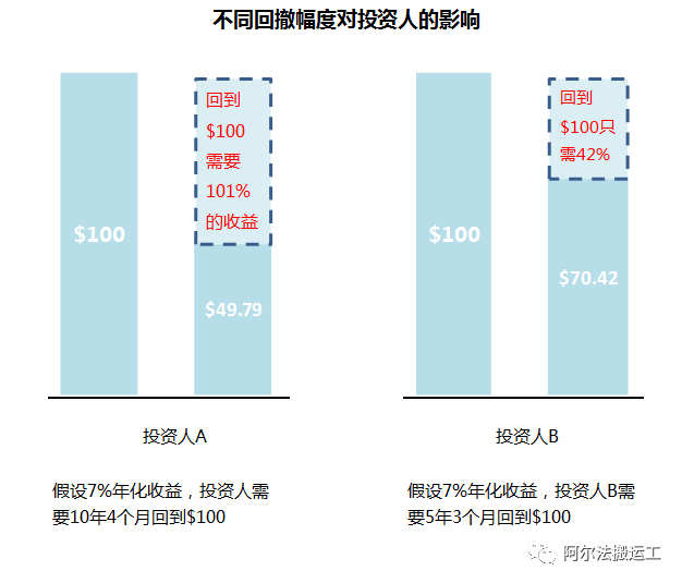 如果假设两个投资人在暴跌之后的年化收益率在7%,投资人A需要10年4个月回到亏损前,而投资人B只需要5年3个月。