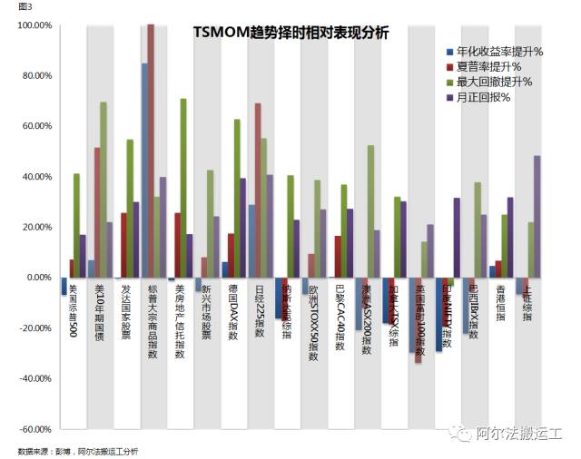 图3用柱型来表示TSMOM择时策略对于买入并持有策略提升的百分比。可以看到除了个别国家TSMOM策略的年化收益率和夏普率相对参照物降低了以外,其他所有指数的几乎所有指标都体现了TSMOM在择时上的显著功效。