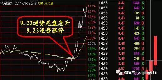 9.23日华芳纺织涨停,9.22日大盘下跌69点时该股尾盘迅速拉升4%。大跌之下大幅度走高,预示着第二天会有动作,即使不如华芳纺织般涨停也会有冲高动作,在前一天尾盘拉升时介入第二天有较好的获利机会。