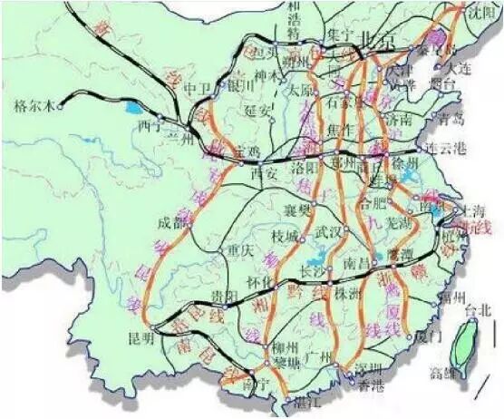 我们先来考察一下知识架构,知识架构和下面这张中国铁路干线分布图很象,都是网状结构,其中图中红色的五条纵向干线和黑色的三条横向干线是主干线(称为“五纵三横”),我用来代表我们最擅长的几个领域的知识,另外,图中还有密密麻麻的大量中小支干线,紧密连接着主干线,我用来代表其他的各种知识,知识与知识之间相互交叉相互渗透,形成我们完整的知识架构。