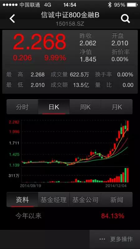 你绝对没看错哦,这是最近风头最劲的信诚800金融B(150158)在二级市场上的表现。超预期的降息全面引爆金融股行情。