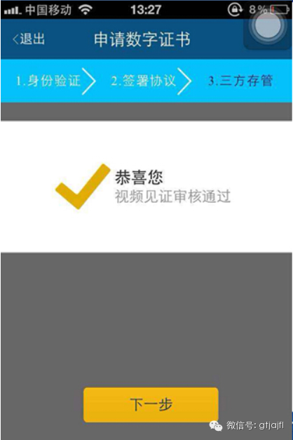 视频界面,需要客户在无代理的wifi环境下或者条件比较好的3g环境下进行视频见证。见证结束后,还需要客户等待见证人员的复核。复核成功后即可进行下一步操作。