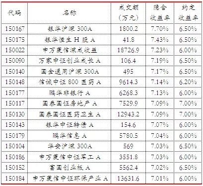 受套利盘放量冲击,A类隐含收益率走高,目前有下表所示15只分级A隐含收益率超过7%,相对于债市的灰暗,成为不可多得的投资良机。