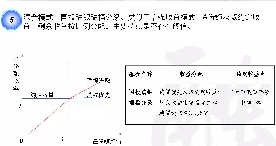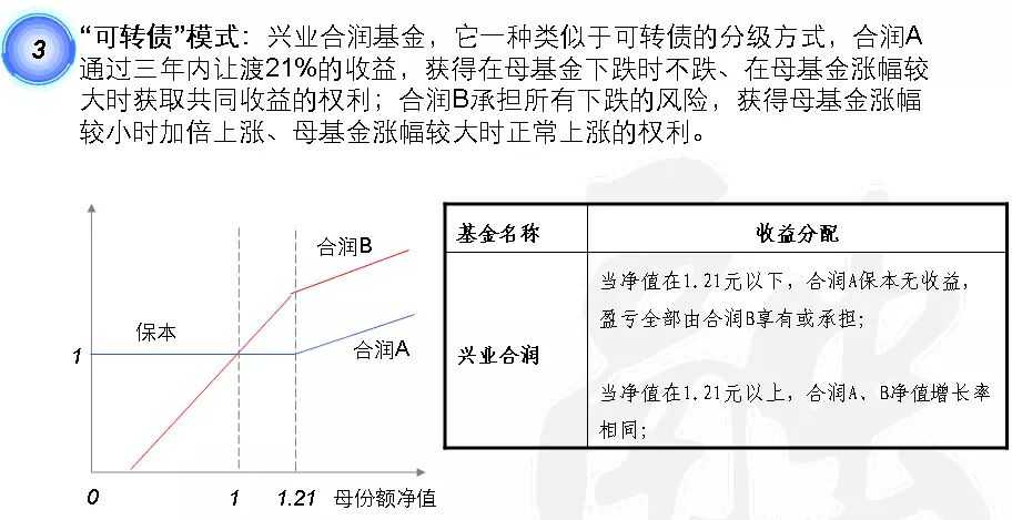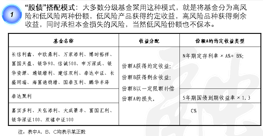 基金分成两份。其中A的收益率是固定的,比如4%,剩下投资收益就归B份额,如果总共赚20%,那么A份额得到4%,B份额得到16%。如果亏损,只要亏损不超过一定的比例(比如80%),那么A份额的收益依然的