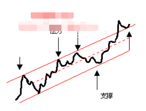 (上升趋势线之支撑与压力:在股价上升趋势中,遇到以往密集成交区或其他阻力位,在某个股价价位上,卖压很大,足以阻止股价上升,或进行使止升走势的股价反转下跌,这种情况便是股逢压力。